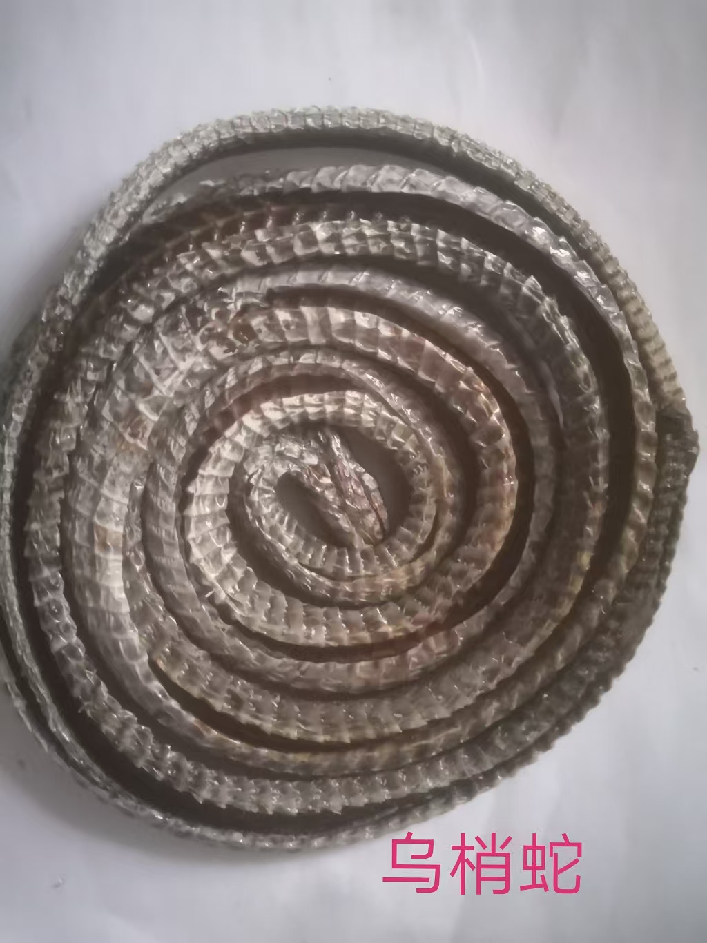 为游蛇科动物乌梢蛇Zaocys dhumnades(Cantor)的干燥体。全国大部分地区有分布。多于夏、秋二季捕捉,剖开蛇腹或先剥去蛇皮留头尾,除去内脏,干燥。去头及鳞片,切段生用、酒炙,或黄酒闷透,去皮骨用。